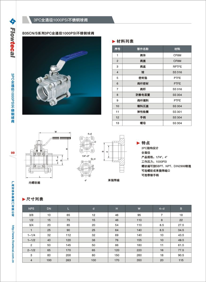 • 3PC全通径1000PSI 不锈钢球阀
